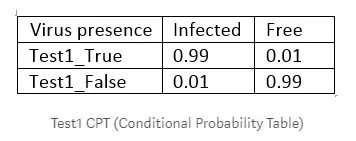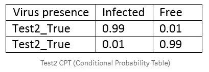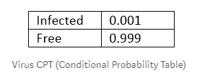 由于它是一种非常罕见的疾病(千分之一的机率被感染)。下表(称为条件概率表)给出了身体中有这个病毒的概率