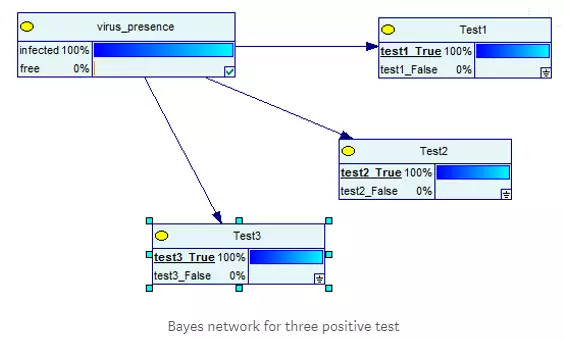 在三个测试中,所有的测试都有一样的准确度,我们可以看到一些有趣的结果。如果你有证据证明这3个测试结果都是阳性的,那么现在100%肯定你被病毒感染了。