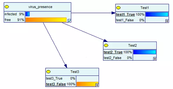 然后,当我提供证据证明测试结果是True。由于只做了一次测试且结果是阳性的,因此该网络告诉我病毒存在于你的身体里,但是实际上病毒存在的概率只有9%!