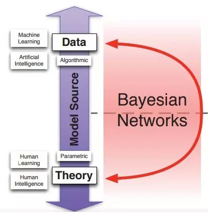 关于在模型源上如何进行理论与数据的横向划分,贝叶斯网络有其特殊性。贝叶斯网络可以建立在人类的知识上,即理论上,也可以从数据中学习。因此,他们可以使用整个光谱作为模型源。此外,由于其图形结构,基于机器学习的贝叶斯网络在视觉上可以解释,因此也促进了人类学习和理论的发展。