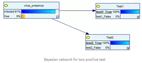 这意味着:如果进行了两个阳性的测试,患该病的几率增加到了91%。由于加上了上一次实验的结果,并且是连续的两次实验,患病的几率从9%跳到了91%。但并不是100%!