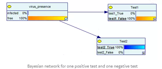 在另一种情况下,如果第二个测试是一个阴性样本,则有100%的几率没有该疾病。