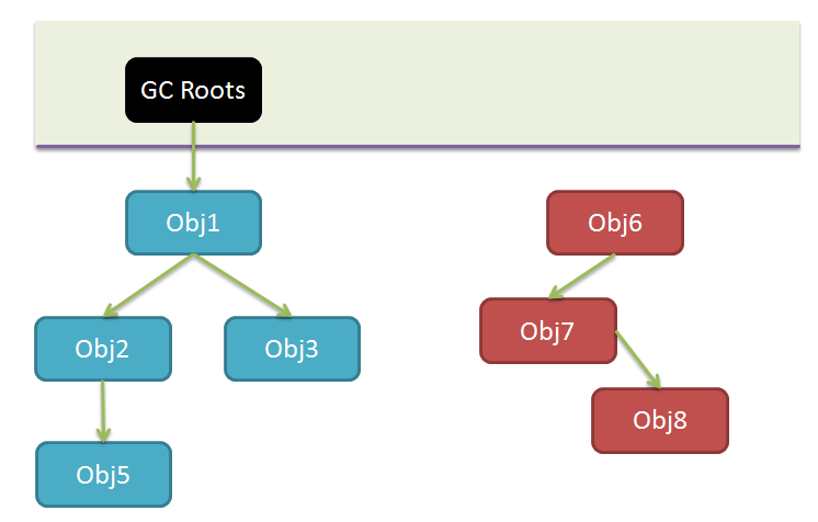 在主流的支持GC的语言中,都是通过可达性分析来判断对象是否存活的。算法思想就是通过一系列的GC Roots作为起始点,然后往下搜索,能够连接到GC Roots的,都证明还是活的,如果断链子了,则证明不可达,也就是对象不是存活的。