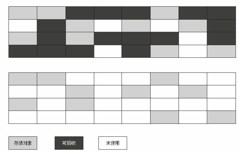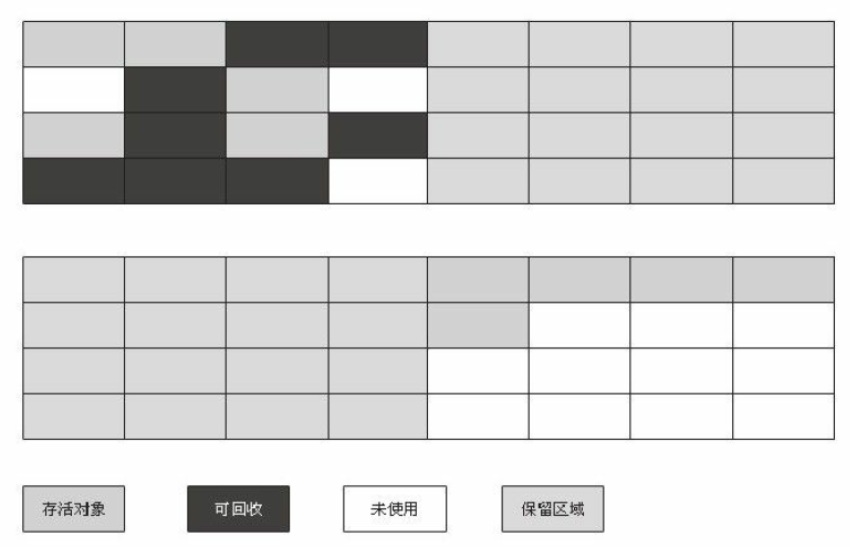 上面提到的赋值算法也有它的弱点,就是当对象存活率很高的时候,就会存在很多的复制操作,从而影响了效率。所以这种算法运用在老年代的话很明显不合适,于是又有了标记整理算法,这种算法的主要思路就是把活跃对象标记出来,之后再向内存的一侧移动,然后直接清理掉端边界以外的内存,具体思路如下: