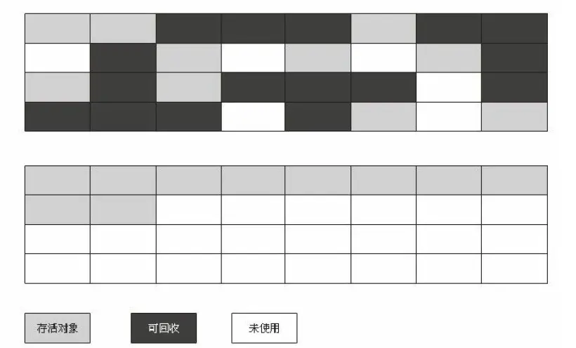 复制算法的思想就是把内存分为两块,每次只在一边分配内存,当一边的内存用完了,就把所有还存活的对象复制到另一半去,这时候把原来使用过的这一边的所有空间一次性清理掉,所以也就不存在内存碎片的问题了,基本思路如图: