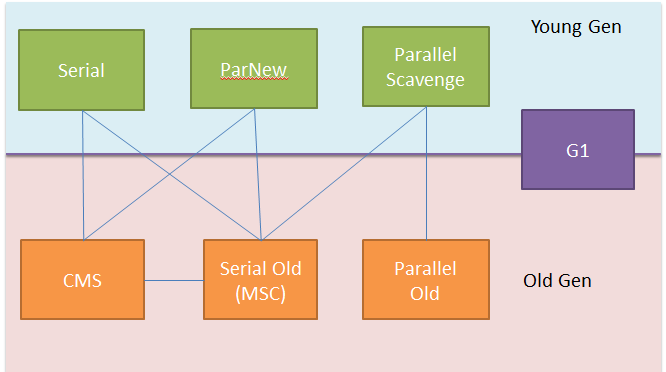 目前看主流的垃圾收集器也就下面这些,其中Serial、ParNew、Parallel Scavenge主要应用在新生代,CMS、SerialOld、Parallel Old主要应用在老年代,而G1的回收范围是整个Java堆(包括新生代和老年代)。有连线的说明彼此之间可以结合使用。