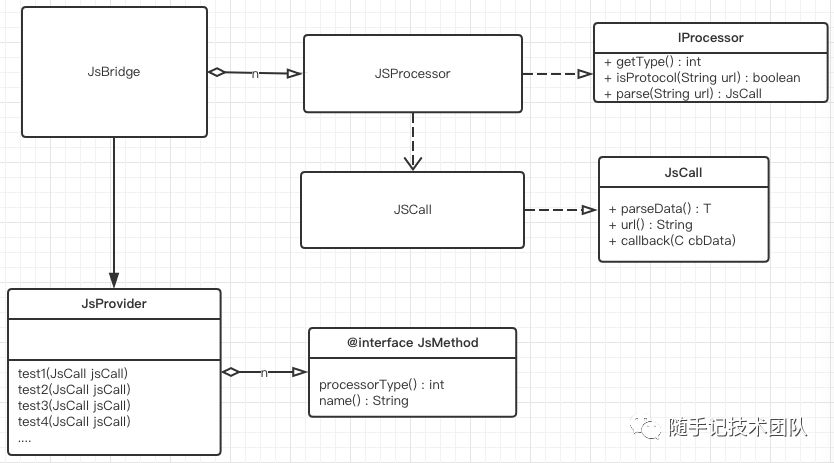 JsBridge: 整个Js框架的管理,提供对外的接口,连接Processor和JsProvider。