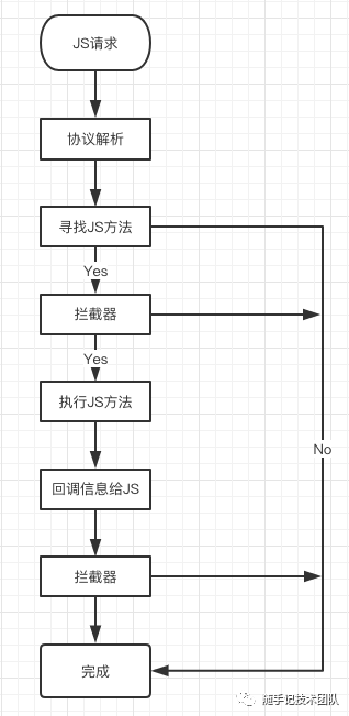 这样的模式和系统提供的JavascriptInterface方式基本一致,但是我们可以做的事情比JavascriptInterface方式更多,而且整个系统解耦清晰,但是这个结构实际上还缺乏较多的东西,无法达到设计的目标,整个流程中缺乏扩展性,没有拦截和二次处理机制。