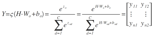其中,ς表示softmax函数。Y表示最后输出的n*2的矩阵,Zod表示矩阵Zo的第d列,Wod表示矩阵Wo的第d列,bod表示向量bo的第d个元素。