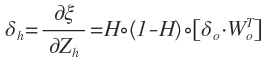 其中,Zo(Zo=H⋅Wo+bo)是一个n*2的矩阵,T是一个n*2的目标矩阵,Y是一个经过模型得到的n*2的输出矩阵。因此,δo也是一个n*2的矩阵。