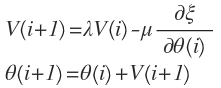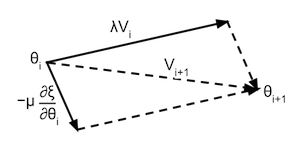 其中,V(i)表示参数第i次迭代时的速度。θ(i)表示参数在第i次迭代时的值。∂ξ/∂θ(i)表示参数在第i次迭代时的梯度。λ表示速度根据阻力减小的值,μ表示学习率。这个数学描述公式可以被可视化为如下图: