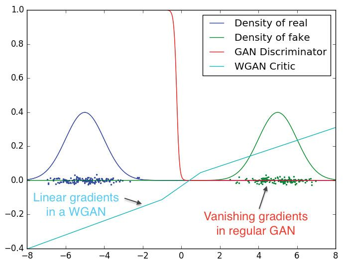 使用次修改的目的,作者还避免了一个称为模式崩溃的问题,其中标准 GAN 仅从可能输出的一个子集中产生样本。例如,如果一个 GAN 正在训练产生手写的数字4和6,则 GAN 可能只生产4,并不能在训练中规避这个局部最小值。而通过消除在训练目标梯度,即所谓的 Wasserstein GAN 来避免此问题。