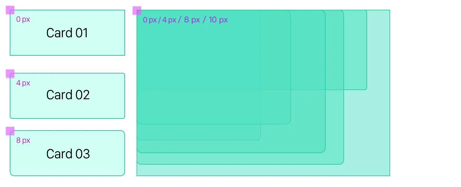 接着随着卡片在更多场景下的使用,右侧这些不同尺寸、不同圆角的 card 就出现了。到最后没人能够搞清楚究竟有多少圆角矩形,也没人知道究竟该如何使用。