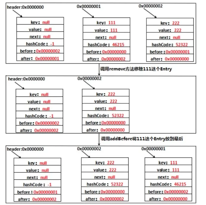 - LinkedHashMap的数据存储和HashMap的结构一样采用(数组+单向链表)的形式,只是在每次节点Entry中增加了用于维护顺序的before和after变量维护了一个双向链表来保存LinkedHashMap的存储顺序,当调用迭代器的时候不再使用HashMap的的迭代器,而是自己写迭代器来遍历这个双向链表即可。