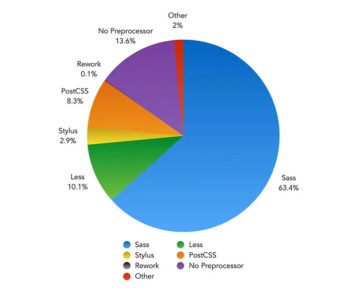 目前最主要的CSS预处理器有三款:Sass, Less和Stylus,其中最受欢迎的是Sass。这不是我说的,有图为证: