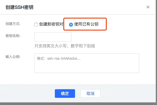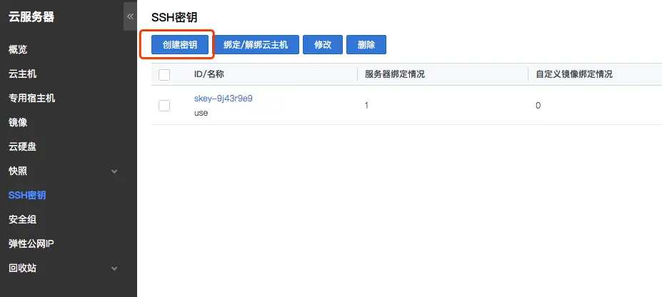 首先登陆到腾讯云后台,然后到云服务器管理界面,点击SSH密钥。然后点击创建密钥,选择使用自己的公钥。