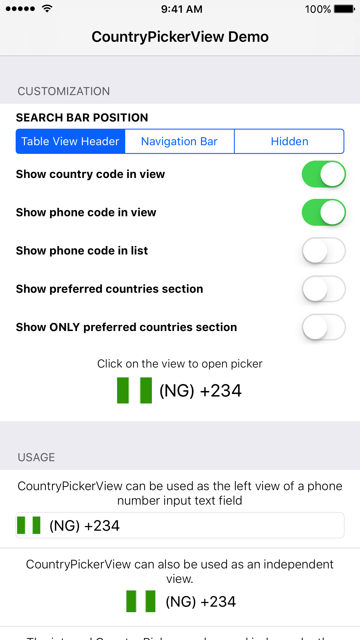Customization options for the view itself are available directly via the CountryPickerView instance while options for the internal CountryPicker table view are available via the CountryPickerViewDataSource protocol. Setting the CountryPickerViewDelegate protocol is also necessary if you wish to be notified when the user selects a country from the list.