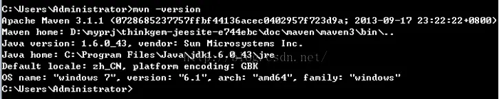 mvn 是 maven 的一个指令,mvn-version 是查看版本信息,我的操作系统是 64位的WIN7,安装的 maven 是 3.1.1,如果能打印如上信息,说明到此 Maven3 已经在你的电脑上安装完成。