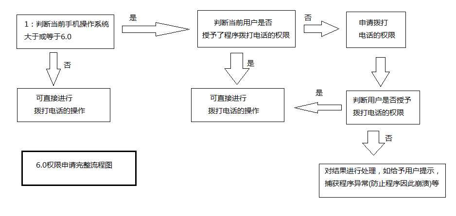 而在6.0以上的手机中,我们则需要通过一些步骤,确定当前程序是否拨打电话的权限,如果有权限,则可以和如上方式一样直接调用call()方法来打电话,但是若检测到当前程序没有拨打电话的权限。那么,我们需要通过如下操作来进行处理: