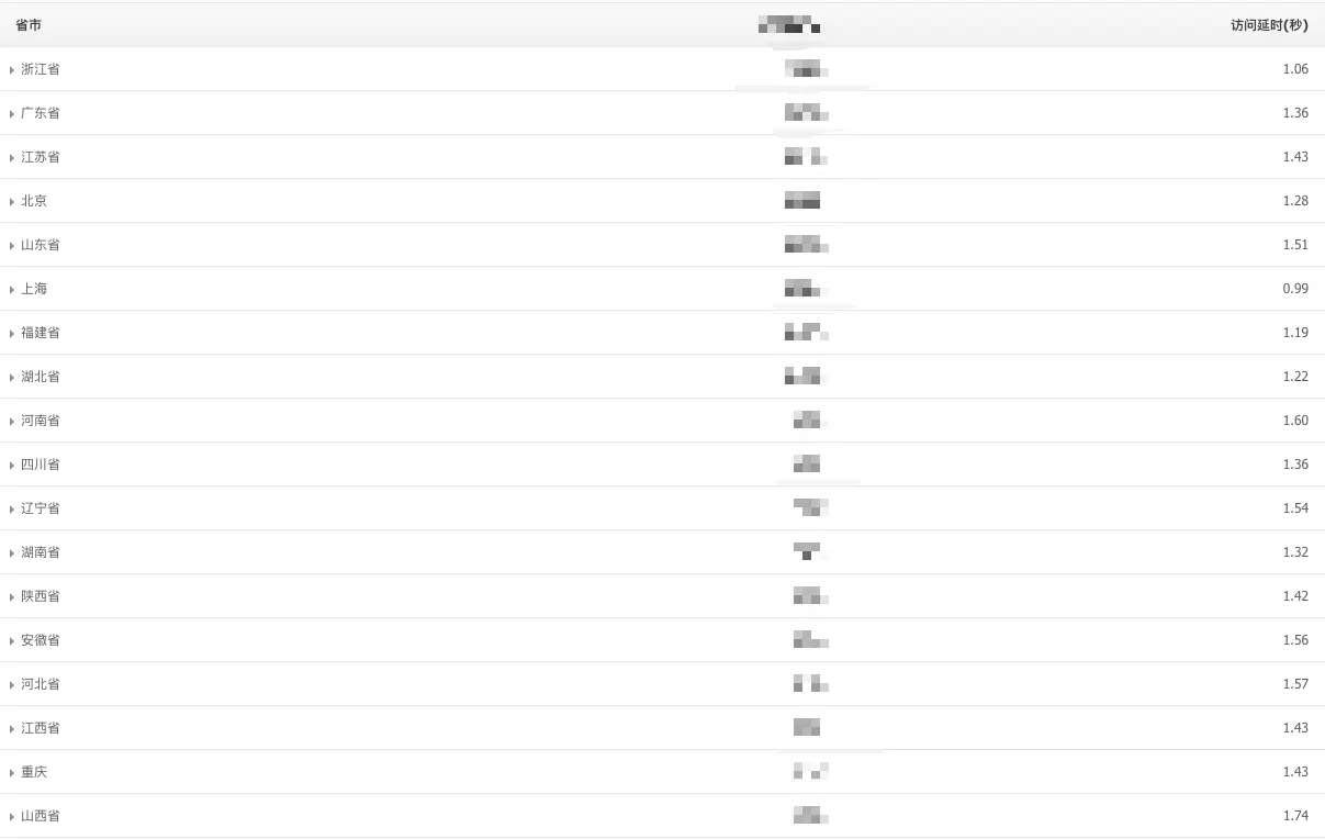 2018.01.02 早上的页面响应速度数据,目前国内各省份平均加载速度在 0.99~2s(虽然没有达到 1s 内加载,但是以目前业务量级,这样的速度是可以被接受的):