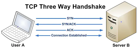 A:请求通话。(SYN) B:请求通话。收到。(SYN+ACK) A:收到。(ACK)