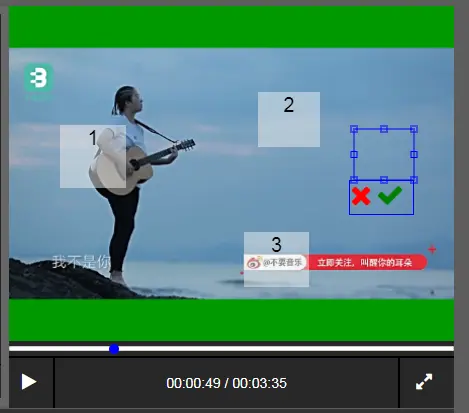 为一个视频添加一个覆盖物,从而挡住视频某区域,在视频的某一时间段,比如第10到第20分钟不显示划定的这块区域。应用场景包括遮挡卫视图标、遮挡视频右下角广告、充当马赛克等。