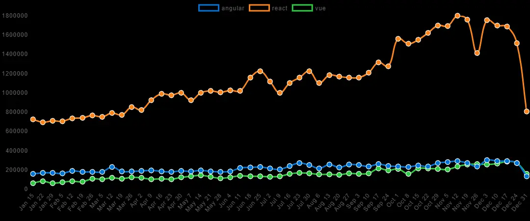 React被描述为“用于构建用户界面的JavaScript库”。 React最初于2013年3月发布,由Facebook进行开发和维护,Facebook在多个页面上使用React组件(但不是作为单页应用程序)。 根据Chris Cordle撰写的这篇文章,React在Facebook上的使用远远多于Angular在Google上的使用。 React还被Airbnb,Uber,Netflix,Twitter,Pinterest,Reddit,Udemy,Wix,Paypal,Imgur,Feedly,Stripe,Tumblr,Walmart等(根据Facebook,stackshare和libscore.com)使用。