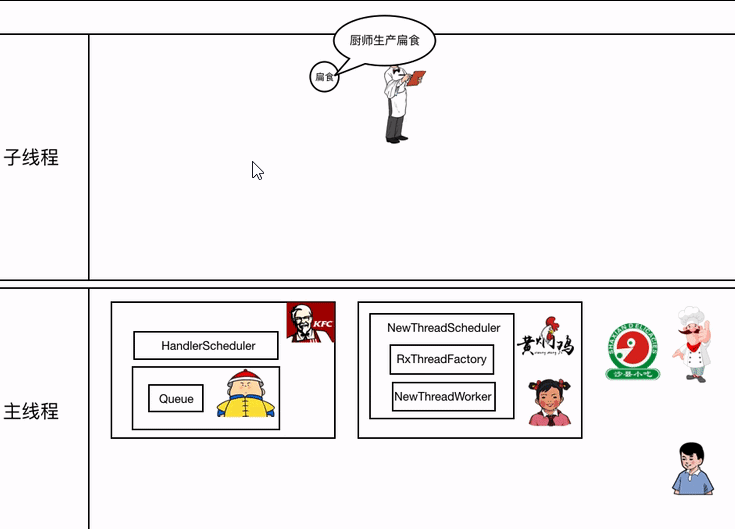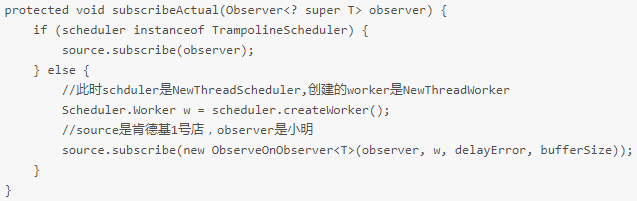 这里会创建小强(ObserveOnObserver),为了和后面区分开,就叫他2号店小强,2号店小强持有小明的引用,之后执行肯德基1号店的 subscribeActual ,observer 是肯德基2号店小强