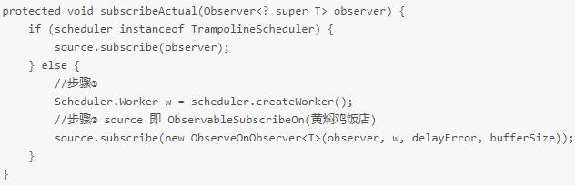 由上两篇分析可知,这里会先去执行 ObservableObserveOn(肯德基) 的 subscribeActual(observer) 方法,这里的 observer 是顾客小明