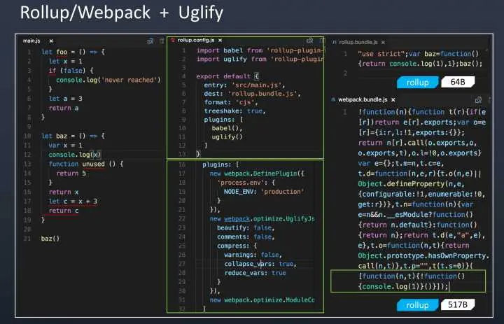 三大工具的tree-shaking对于无用代码,无用模块的消除,都是有限的,有条件的。closure compiler是最好的,但与我们日常的基于node的开发流很难兼容。