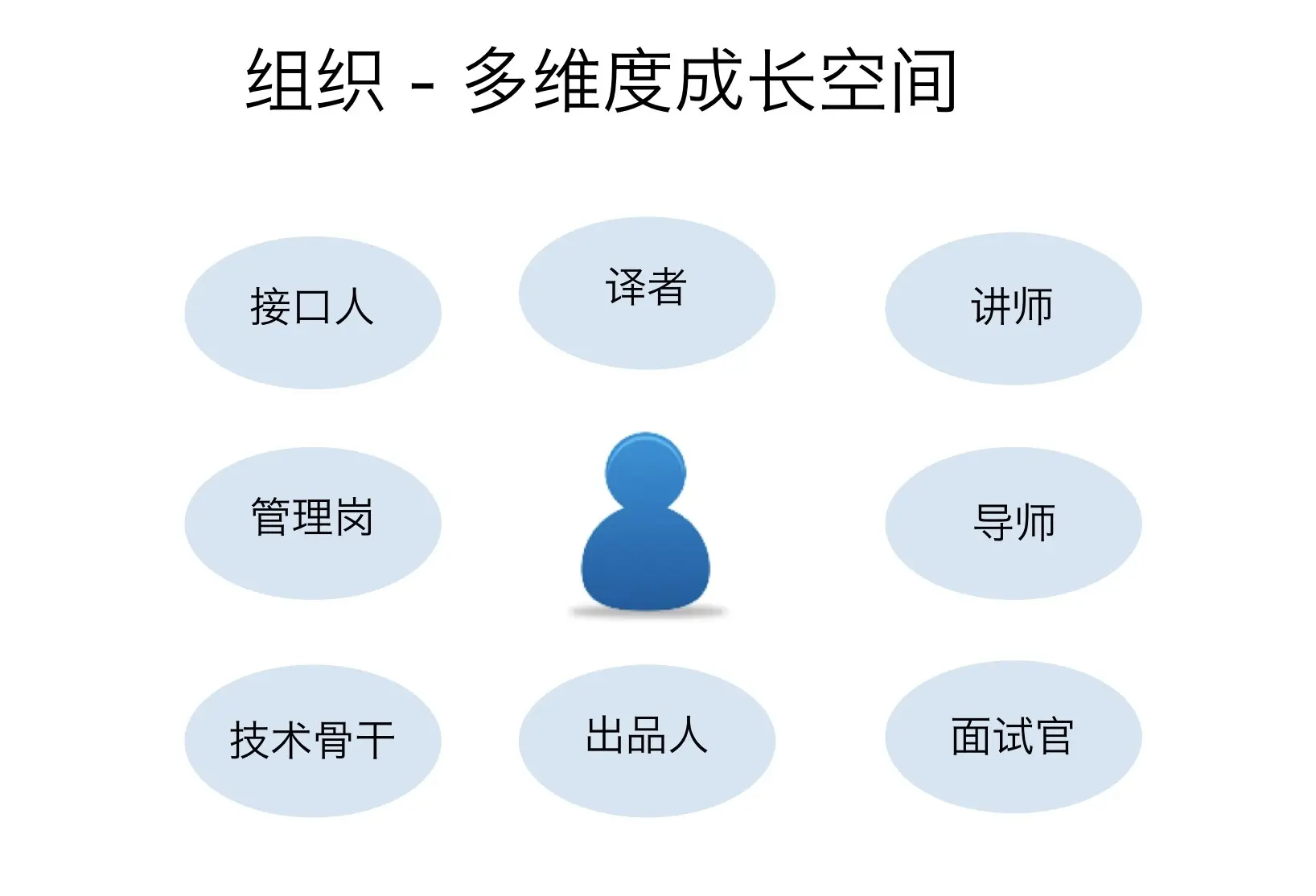 在这里,月影提出一个观点 —— “重组织、轻管理”,对每个人单独的管理不如更宏观地规划处一系列的“大道”,让成员自行选择。当然,这里的一系列“大道”肯定要满足两个条件,就是上文所说的“多元化”和“闭环”(下图是 奇舞团 的多元化、多维度的成长空间)。虽然,当前团队也有类似的“大道”,但是维度并不足够;而且,当团队发展到一定的规模后,低维度的成长空间会可能会制约团队成员的行动力,所以,根据公司、团队自身情况建立不同的成长空间、成长路线是很有必要的,或许这将是笔者2018年在团队内主要推动的事情。