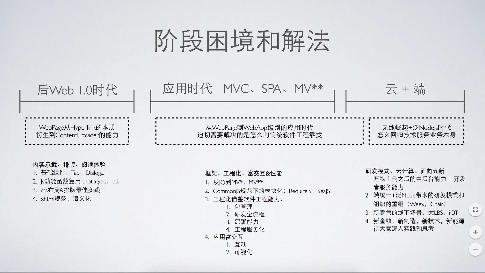 上面是 支付宝加里 分享了一张PPT,类似的 Q 还包括很多,“为什么代码还是原来的”、“为什么点击没反应”、“iOS 没毛病,Android 挂了”。对于这类繁多的业务人员反馈的问题,是烦人也棘手的;你不能奢求业务人员去自己解决,况且有些问题,业务人员根本解决不了。在这时,你就需要一个完善的工具、服务等等其他的一些东西,来快速定位问题,或者来证明“问题不是框架的,是业务自身的”。因此,在未来一年或者几年,对于中台、对于大前端的架构团队,更完善的生态 和 更好的服务 应该被首要关注的。