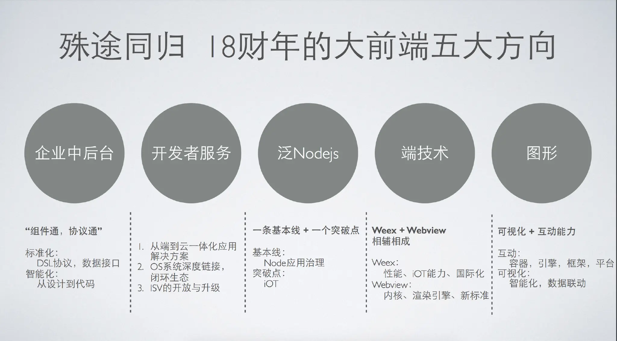 2017仍是大前端火热的一年,但发展也已经从“野蛮生长”变为“颇具匠心”,越来越多稳定成熟的架构方法被广泛使用。与此同时,时代的热点已经转到机器学习和加密货币,而主项是 UI 的大前端发展又将何去何从呢。或许历史已经给出答案,传统后端默默地做了许久的模块化、服务化,伴随着云的兴起,又迎来新一春。或许,大前端的“中台化”,是大前端发展接下来最重要的一步。
