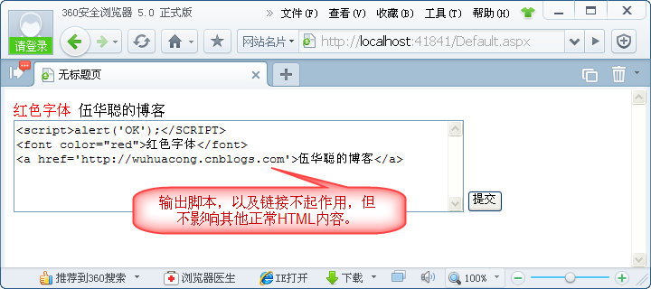 不受信任的HTML代码。 | <a href=”http://www.cnblogs.com”>Click Here [不受信任的输入]</a> |