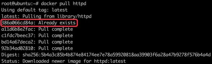 除了构建时使用缓存,Docker 在下载镜像时也会使用。例如我们下载 httpd 镜像。