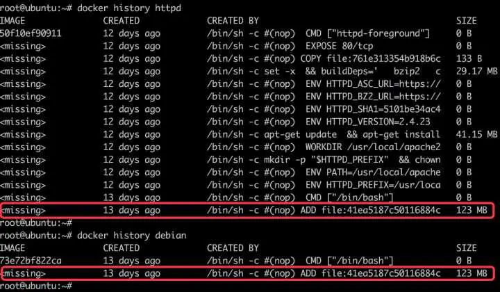 由 Dockerfile 可知 httpd 的 base 镜像为 debian,正好之前已经下载过 debian 镜像,所以有缓存可用。通过 docker history 可以进一步验证。