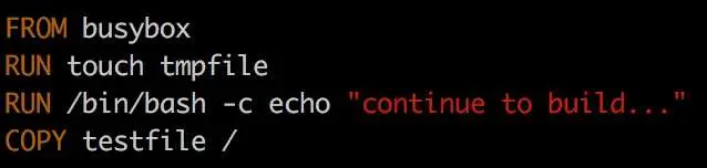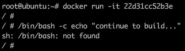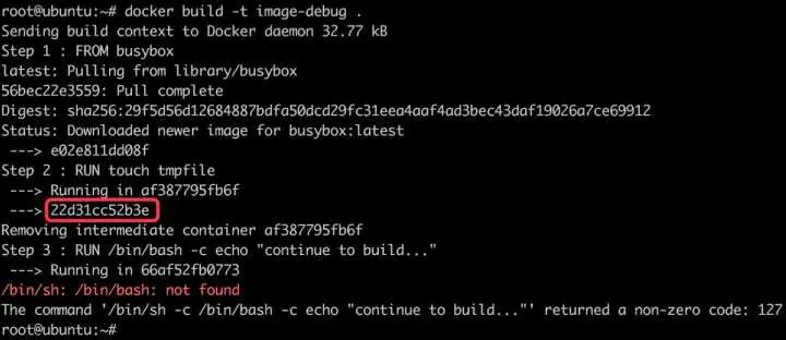 手工执行 RUN 指令很容易定位失败的原因是 busybox 镜像中没有 bash。虽然这是个极其简单的例子,但它很好地展示了调试 Dockerfile 的方法。