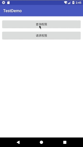 这里用到系统提供的 ContextCompat.checkSelfPermission 方法,用于检测某个权限是否已经被授予,方法返回值为 PackageManager.PERMISSION_GRANTED 表示已权限,为PackageManager.PERMISSION_DENIED 表示无此权限需要进行申请授权。