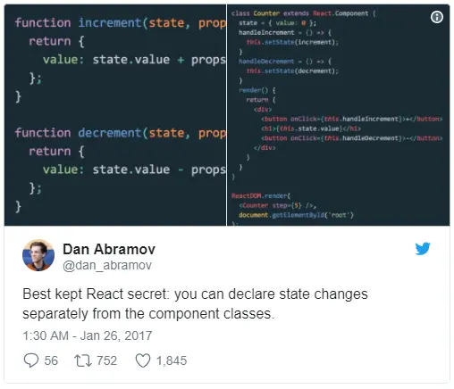 再者,Dan Abramov 也说过: Reducer 就是一个很普通的函数,你可以抽出一些代码独立成函数,也可以在里面调用其他的函数,具体实现可以自由发挥。