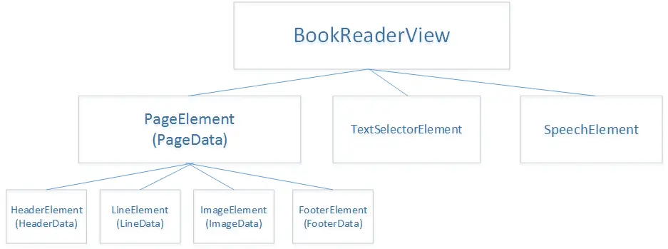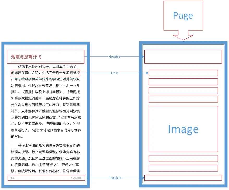 一般来说,阅读器获取数据都是一章一章来的,不管是从网络上还是本地。而获取过来的数据阅读器要进行分页才能展示。如上图所示,书页展示由 PageElement 模块负责,该模块接收从 BookReaderView 传入的章节数据,然后再经底下的4个模块计算来分页。