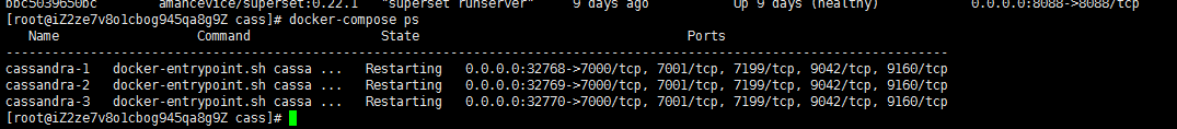 **注释:**这里面一个重要的技巧是:在Docker的容器网络模型中(CNM, Docker Network Model),同一网络中的容器可以通过容器名互相访问。 现在,我们可以轻松利用 docker-compose 命令来启动Cassandra集群了 $ docker-compose up -d 启动之后,我们可以方便地查看集群状态