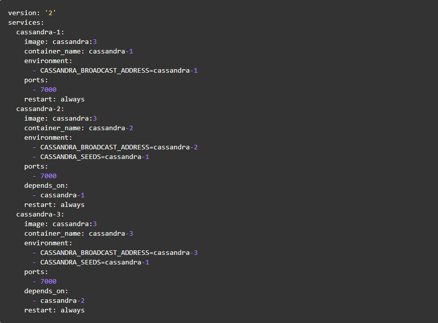 下面的Docker Compose模板将为你创建一个包含3个节点的Cassandra集群,其中第一个容器“cassandra-1”为seed节点。