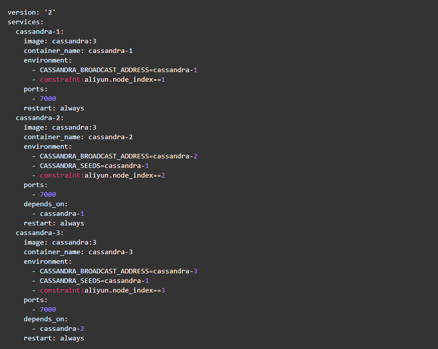 利用阿里云容器服务,我们可以直接使用上文Compose模板部署Cassandra集群,但是为了防止在相同的ECS实例上部署了超过一个个Cassandra节点,我们可以添加部署约束来指明不同的Cassandra节点部署到不同的ECS示例上