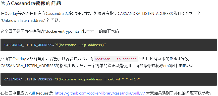 Docker Hub上已经提供了Cassandra的官方镜像,可以方便地创建单节点Cassandra实例或Cassandra集群。Cassandra采用去中心化的集群架构,没有master节点的概念;但是会有seed节点在新节点连入时通知当前集群。