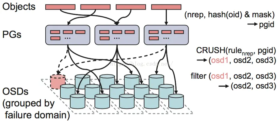 CRUSH(x=pgid,osd map, rule) = (osd0, osd1, osd2 … osdn)