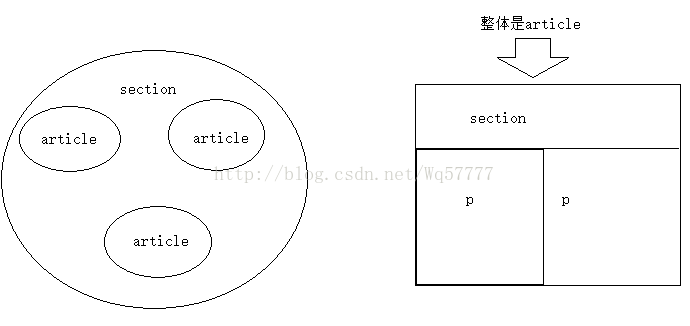(当article包含section时,article是一个大主体,section只是组成整体的一部分,比如“星空”包含着“月亮,太阳,星星”,而section只是一种星星;当section包含article时,section 是大整体,article是独立的)