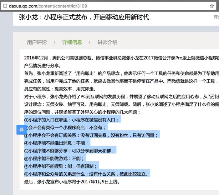 为了描述准确,特地去腾讯大学网站截了个图。现在大家都知道,小程序有了入口,还不止一个(搜索、下拉、发现);从只能扫码打开到长按二维码也能打开;小程序和公众号可以绑定;