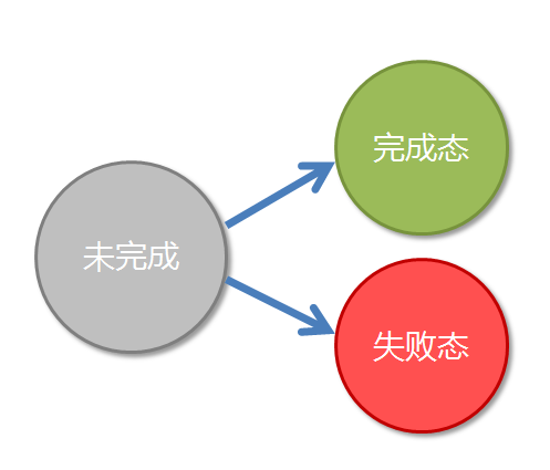 注意,这种状态的改变只会出现从未完成态向完成态或失败态转化,不能逆反。完成态和失败态不能互相转化,而且,状态一旦转化,将不能更改。