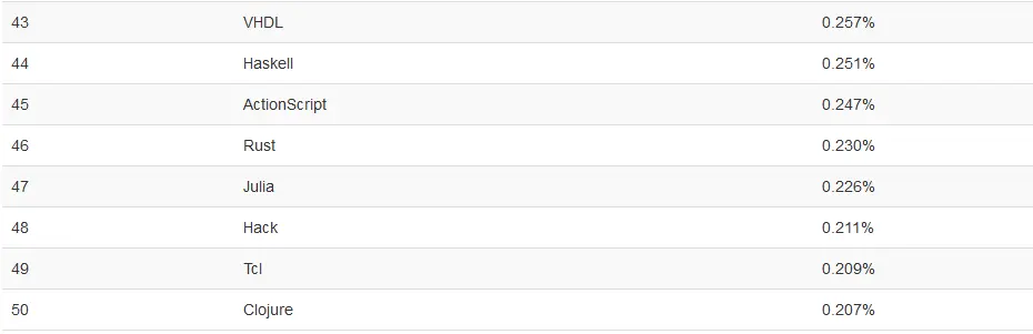 同样被看好的还有 Julia 和 Hack,他们成功跻身前 50 榜单,Rust 虽然较之 2016 年排名有所下滑,不过也值得期待。