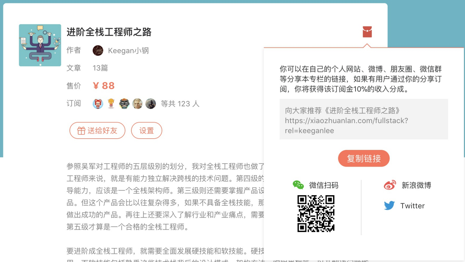 第二个长期活动则是推荐订阅活动,大家在专栏首页标题右边可以看到一个小红包,如下图,鼠标移到上面可以看到有自己的分享链接的,将这个链接分享出去,别人通过这个链接订阅了本专栏的话,那你是可以得到订阅金10%的收入分成的。而当你推荐订阅的人数超过10人以上时,也会额外有以上那些奖品的奖励,推荐订阅的人数越高,奖励越高。